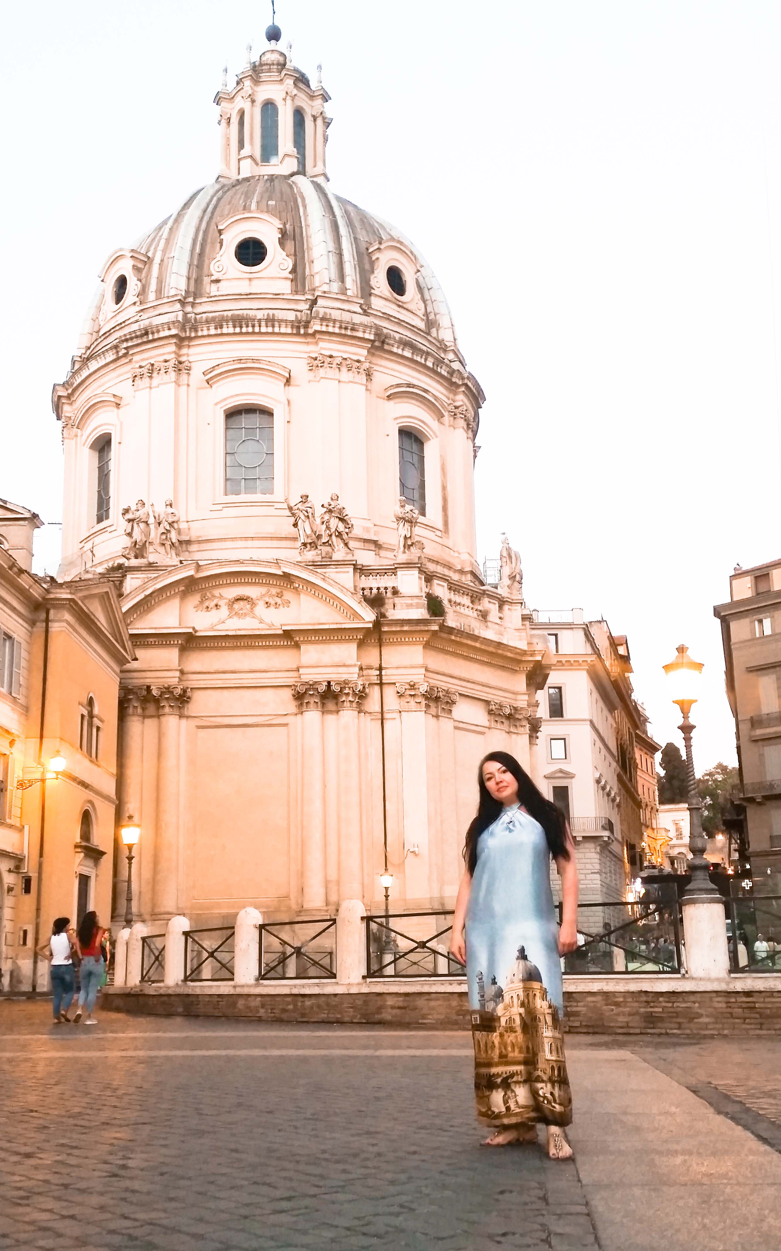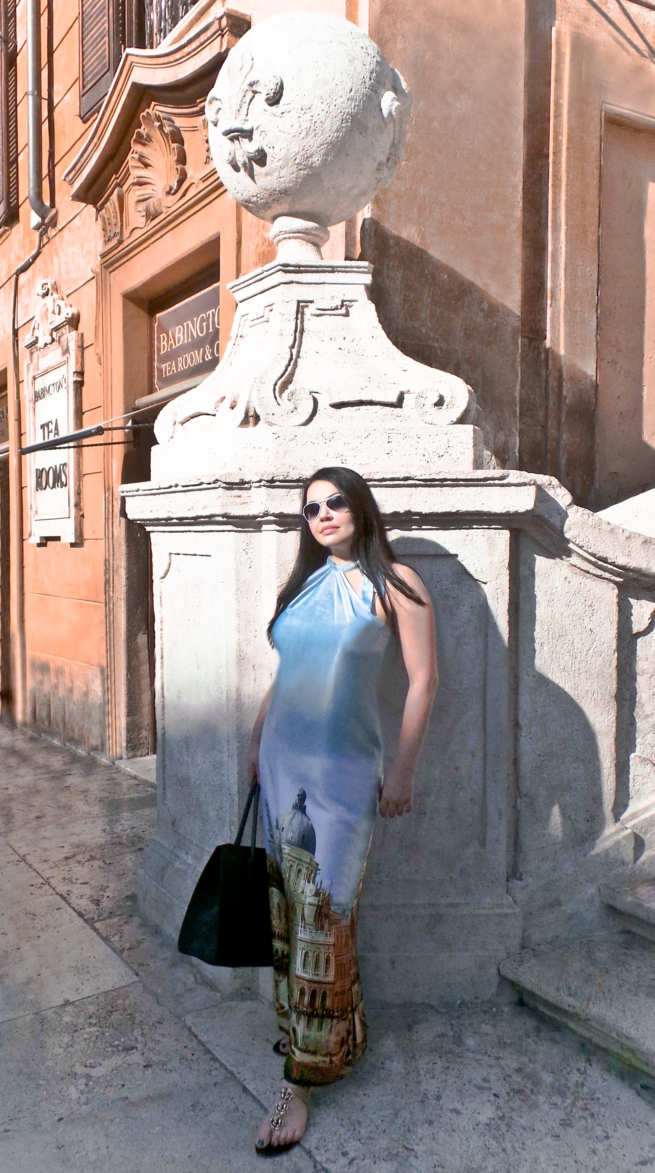 Шелковое платье с принтом Италии фиксируется завязкой бант на шее сбоку, два незаметных разреза по бокам снизу спроектированы для комфорта при хотьбе.